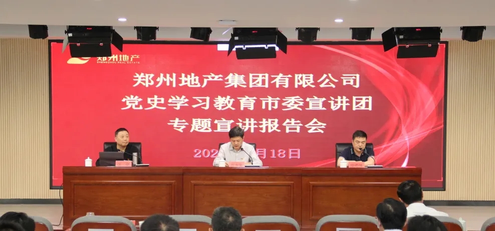 為持續(xù)推進(jìn)黨史學(xué)習(xí)教育走深走實,5月18日上午,鄭州市委宣講團(tuán)走進(jìn)鄭州地產(chǎn)集團(tuán),在集團(tuán)301多功能廳開展黨史學(xué)習(xí)教育專題宣講報告會。報告會由鄭州市委宣講團(tuán)成員、鄭州工程技術(shù)學(xué)院馬克思主義學(xué)院副教授張豪主講,市國資黨史學(xué)習(xí)教育第二巡回指導(dǎo)組組長、四級調(diào)研員段德強(qiáng),指導(dǎo)組成員張詩雨、陳祥斐到會巡聽旁聽,地產(chǎn)集團(tuán)領(lǐng)導(dǎo)班子、總部全體員工,各子公司支部書記、黨建部門負(fù)責(zé)人等共計150余人參加現(xiàn)場報告會,各子公司員工共計170余人通過線上直播進(jìn)行觀看,會議由地產(chǎn)集團(tuán)黨委書記、董事長萬永生主持。