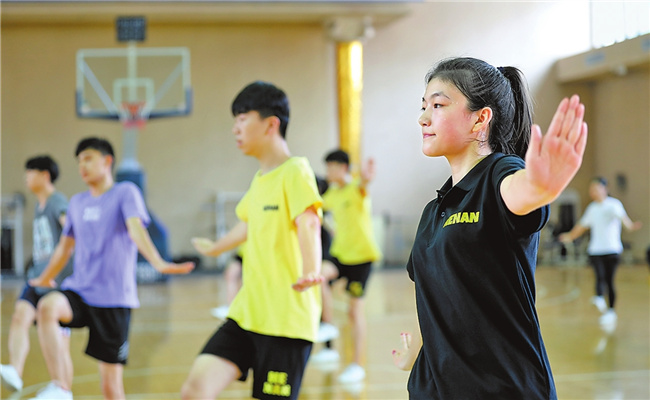 來(lái)自鄭州西亞斯學(xué)院和鄭州七中的18名運(yùn)動(dòng)員正在進(jìn)行民族健身操訓(xùn)練。
