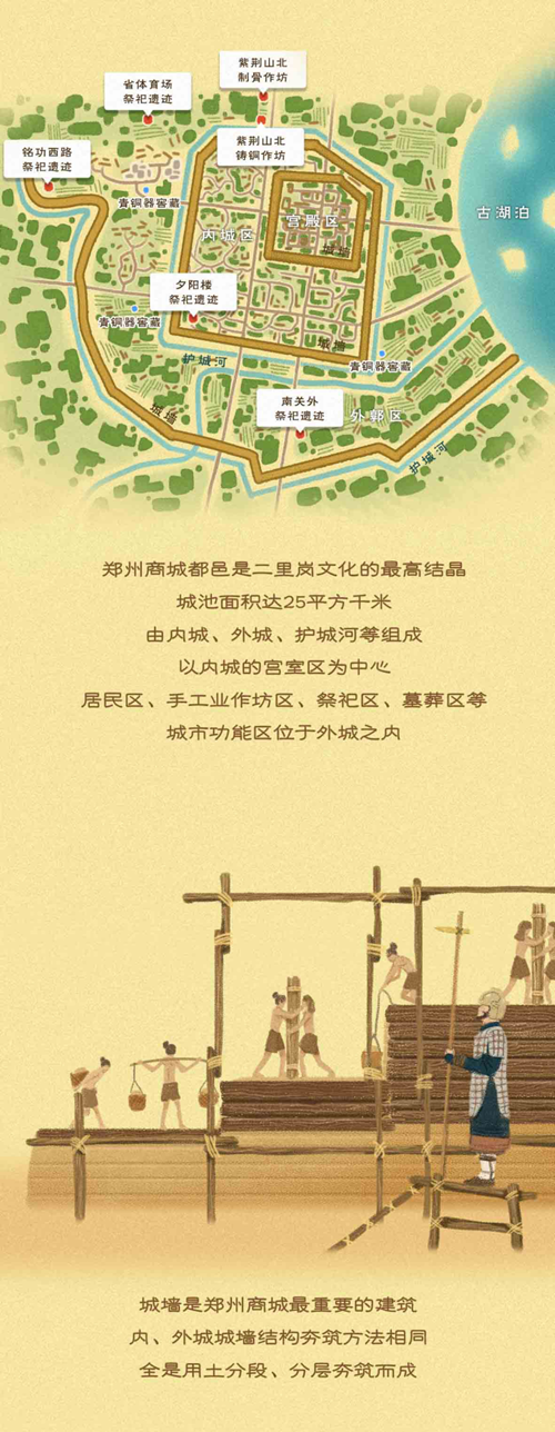 “鄭州商城遺址近似長方形,面積有二十五平方公里。城垣高大,北城墻長約1690米,西墻長約1870米,南墻和東墻長度均為1700米,周長近7公里。城墻底寬20米左右,頂寬5米多,其高度復(fù)原后約10米。”
