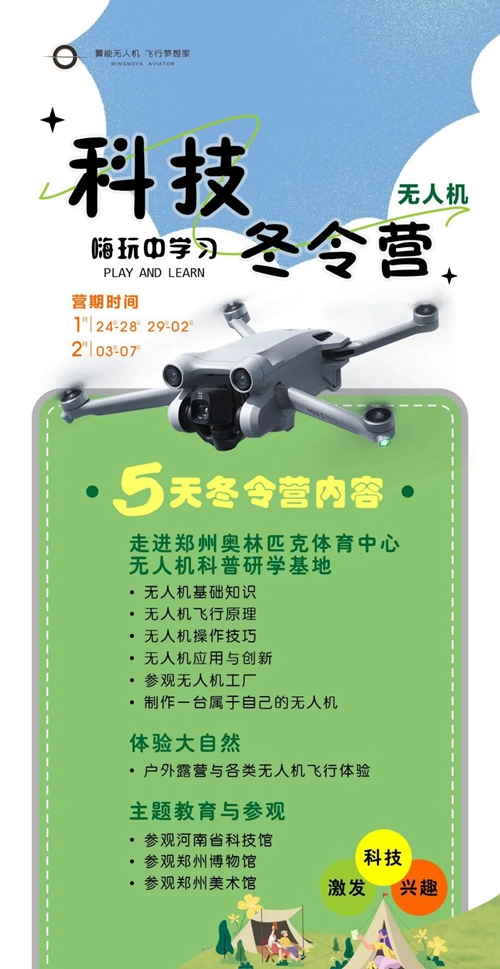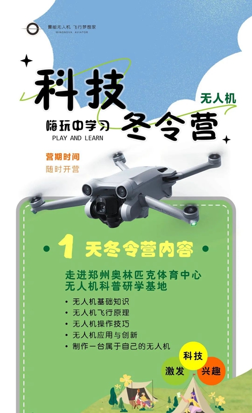 鄭州奧體翼能無人機(jī)研學(xué)基地是集無人機(jī)科普、研學(xué)、開發(fā)、應(yīng)用、賽事運營的綜合服務(wù)平臺,不僅擁有1000余平方米的無人機(jī)科普教育基地,還擁有無人機(jī)駕駛執(zhí)照的培訓(xùn)資格。寒假期間,依托鄭州奧體中心開闊場館,翼能無人機(jī)將科普知識與實操表演完美結(jié)合,分別開設(shè)1至5天不等的科技冬令營,代領(lǐng)孩子們放飛科技夢,在嗨玩中學(xué)習(xí)。
