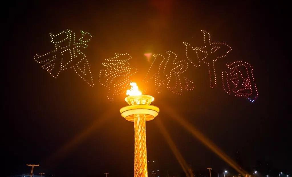 當現(xiàn)場屏幕通過虛擬技術(shù)應用,呈現(xiàn)出美麗的畫面,讓現(xiàn)場觀眾仿佛置身北國北川、南嶺飛瀑之中,觀眾都情不自禁地揮舞起了手中的國旗為他們的表演喝彩!為我們偉大的祖國喝彩!1000架無人機從奧體中心廣場升起迅速變換成中中的造型,點燃民族運動會的火炬。
