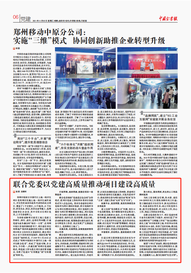 西流湖公司始終堅持“抓好黨建就是最大的政績”,創(chuàng)新“黨建進(jìn)總包合同”合作模式,貫徹落實“支部建在項目上,黨旗飄在工地上”的工作思路,以中原新區(qū)中部片區(qū)土地一級開發(fā)聯(lián)合黨委和項目黨支部建設(shè)為抓手,以“12343”黨建工作體系為指引,讓黨的主張、黨的作風(fēng)、黨組織的力量在項目建設(shè)中處處彰顯,充分激發(fā)黨員的先鋒模范作用和黨組織的堅強堡壘作用,將黨建轉(zhuǎn)化為生產(chǎn)力,真正實現(xiàn)黨建促發(fā)展的“紅色引擎”作用。公司黨建工作先進(jìn)經(jīng)驗榮登《中國企業(yè)報》,意味著公司黨建工作先進(jìn)經(jīng)驗對于全國企業(yè)黨建具有良好的借鑒意義,標(biāo)志著公司黨建工作及宣傳水平再上新臺階。